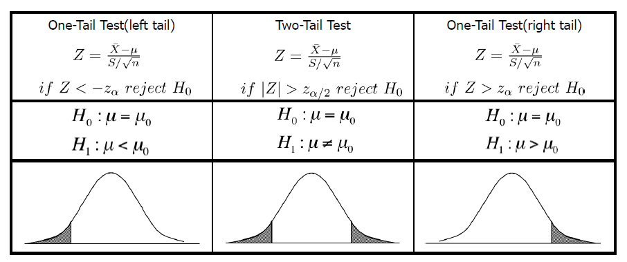 이때 대립가설이 $\mu$와 $\bar{x}$의 관계를 '같지 않다' '크다' '작다' 어떻게 설정하느냐에 따라 세가지로 나뉜다.